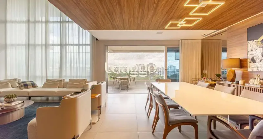 Apartamento com 226m², hall, living amplo para 2 ambientes com lareira, sacada com piscina privativa, área da churrasqueira com bancada e lavabo, cozinha equipada, área de serviço separada e dependência de empregada completa. Na parte intima conta com 2 suítes master e banheira de hidromassagem e closet.