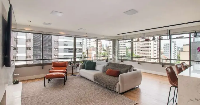 Este apartamento mobiliado de 138m² oferece conforto e praticidade no bairro Petrópolis. Conta com 2 suítes, incluindo uma suíte master com closet, além de um living amplo para dois ambientes com esquadrias em L que garantem ótima iluminação natural. O espaço social integra lareira, cozinha com churrasqueira, lavabo e área de serviço independente. O imóvel ainda dispõe de 3 vagas individuais e escrituradas, um diferencial na região.