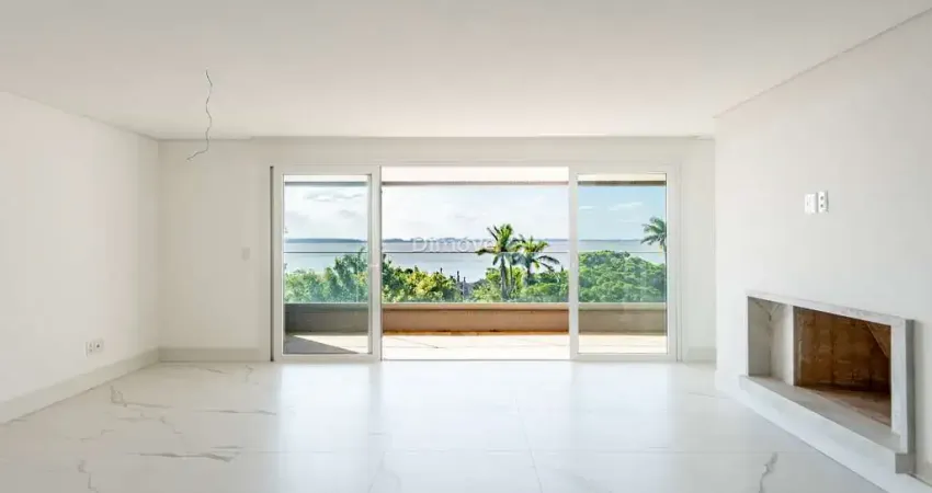 Aparamento alto padrão com vista para o pôr do sol do Guaíba. Amplo living com lareira, lavabo, terraço que integra ao ambiente com churrasqueira, cozinha mobiliada e 3 amplas suítes.