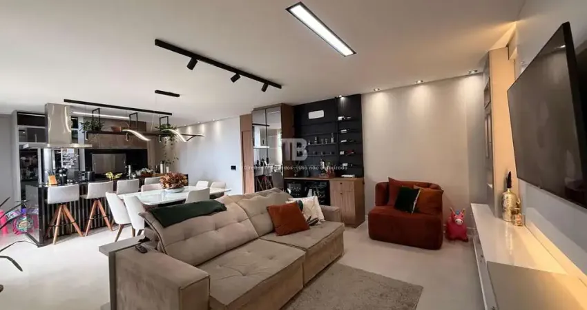 A área social é composta por sala de estar e sala de jantar integradas, criando um ambiente contínuo e funcional para o cotidiano. A cozinha gourmet possui armários embutidos e está posicionada de forma estratégica para facilitar a circulação e o preparo das refeições. O apartamento conta ainda com lavabo, área de serviço independente e armários embutidos em diferentes ambientes, contribuindo para melhor aproveitamento do espaço e organização.