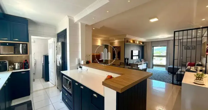 Apartamento 3 quartos em Balneário, Florianópolis com 124m² privativos e vista para o mar. O imóvel possui 3 dormitórios sendo 2 suítes, 1 banheiro social, escritório interno e 2 vagas de garagem livres com Hobby Box. Acabamentos de qualidade incluem porcelanato, massa corrida, gesso e móveis planejados, além de climatização nos dormitórios, ampla sacada com churrasqueira e incidência solar pela manhã e tarde.