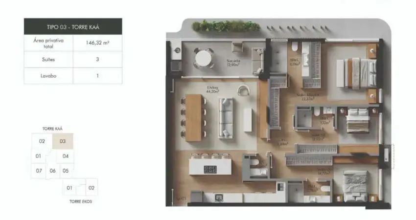 - Apartamento com 3 suítes (sendo uma master com 23,27m²)