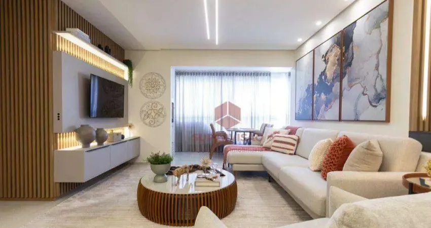 O imóvel conta ainda com banheiro social, lavabo, sala de estar e jantar integradas, cozinha planejada com área de serviço e uma sacada ampla com fechamento em vidro tipo cortina, perfeita para momentos de lazer.