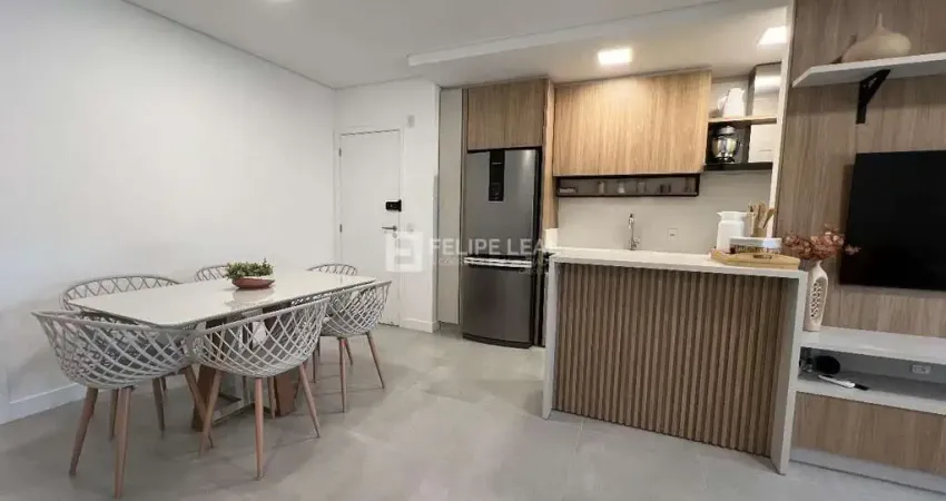 Apartamento mobiliado, climatizado e equipado com living integrado, sacada gourmet com churrasqueira à carvão, lavabo, uma suíte, duas demi-suítes, hobby box e duas vagas de garagem. Ótima posição solar.