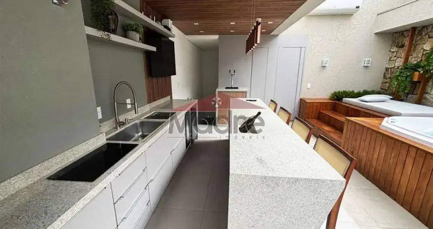 Piso 2: Área gourmet com som ambiente, jacuzzi para até 5 pessoas, Cozinha completa, Churrasqueira, Chopeira na pedra, Teto de vidro retrátil e banheiro completo.
