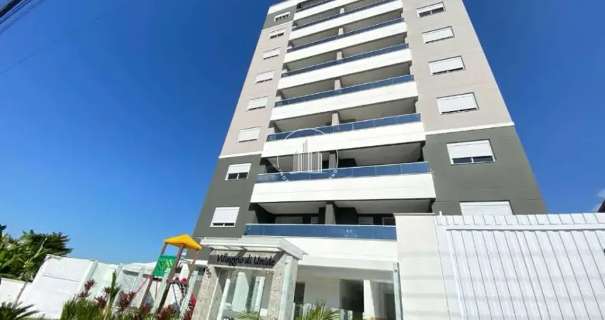 Apartamento 3 quartos em Pagani, Palhoça com 82m² privativos e sacada gourmet com churrasqueira. O imóvel possui 3 dormitórios sendo 1 suíte, 2 banheiros completos e 1 vaga de garagem coberta. Acabamento moderno com porcelanato nas áreas sociais, piso vinílico nos quartos, persianas integradas e espera para aquecedor a gás.