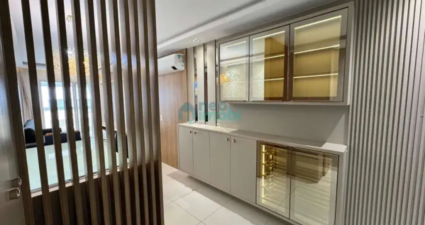 A sacada com churrasqueira a carvão é um dos destaques do apartamento, já fechada com sistema Heick e equipada com cortina de rolo, proporcionando maior conforto térmico e melhor aproveitamento do espaço para receber.