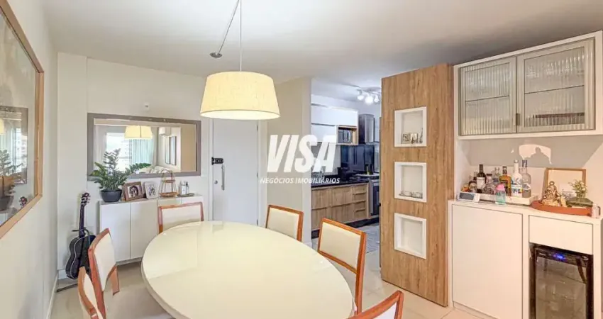 A planta é bem distribuída, com living integrado para sala de estar e jantar, proporcionando funcionalidade no dia a dia. O living se conecta à sacada com churrasqueira a carvão, ampliando o uso da área social. A unidade possui posição solar face norte, garantindo boa iluminação natural ao longo do dia.