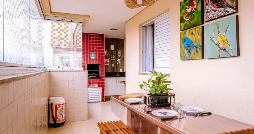 São 3 dormitórios, sendo 1 suíte, todos com armários. Ar condicionados e ventiladores de teto. Sala estar e jantar lindamente decorada, varanda gourmet gigante com fechamento de vidro, home office, cozinha planejada, área de serviço, 2 vagas de garagem cobertas e demarcadas. Piso em porcelanato. Localização privilegiada. Face norte, muito arejado.