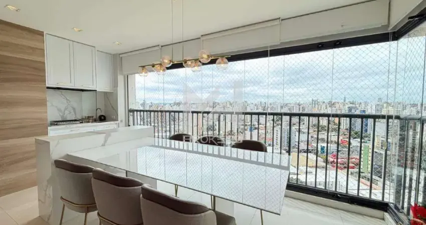 Salas de estar e de refeições integradas à cozinha, lavabo, área de serviços, varanda gourmet com fechamento em vidro.