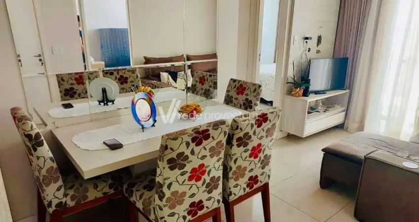 Apartamento à venda na Vila Marieta, Campinas/SP, com 47 m², composto por três dormitórios, sala para dois ambientes, cozinha planejada, banheiro social e lavanderia fechada em vidro.