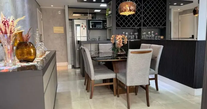 Com essa configuração, possui uma ampla sala de jantar com acabamentos em madeira ripada, espelho, barzinho com cristaleira e adega, a qual integrada a varanda Grill que possui armário, pia, fechamento em vidro e persiana, formam um ambiente lindo e aconchegante; Conta ainda com uma linda divisão para a sala de TV, com nichos e acabamentos ripados. Cozinha estilo americana integrada a sala de jantar e totalmente planejada, com cookto, coifa e forno embutido, a qual dá acesso a área garden do apto, que se encontra coberta e também com piso porcelanato. A suíte é confortável e muito bem planejada, com ótimos armários, cabeceira embutida, mesinha, espelho, arandela e ar-condicionado quente e frio; o outro dormitório também possui ótimos armários, cabeceira e mesa embutida, além de painel para TV. Os banheiros são lindos e funcionais, com box blindex, armários, cubas de sobrepor de mármore travertino e duchas Deca de 12L. O Condomínio possui área de lazer completa, portaria 24 hs e um mini mercado.