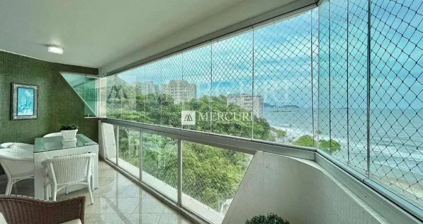 Apartamento repaginado com vista para o mar, sacada com fechamento de vidro, sala ampla para 2 ambientes, cozinha ampla com espaço para 2 ambientes com armários planejados e eletrodomésticos, 3 quartos sendo 2 suítes, banheiro social, área de serviço com armários, dormitório de serviço com banheiro e 2 vagas de garagem.