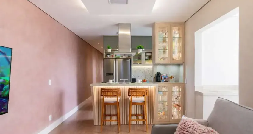 Rebaixo de teto com iluminação direta e indireta, marcenaria integrada com balcão divisor, cristaleira em vidro canelado e projeto luminotécnico completo.