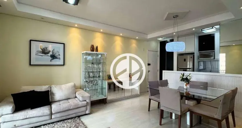 O imóvel conta ainda com banheiro social, sala espaçosa para dois ambientes (estar e jantar), sacada envidraçada com vista interna e panorâmica, cozinha bem ventilada integrada à área de serviço, 1 vaga de garagem coberta e diversos móveis planejados que agregam praticidade, organização e excelente aproveitamento dos espaços.