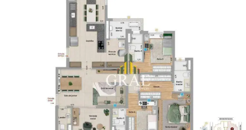 O apartamento: 134m², 3 suítes, lavabo, ventilação cruzada e duas varandas: uma gourmet com churrasqueira a carvão e outra social.