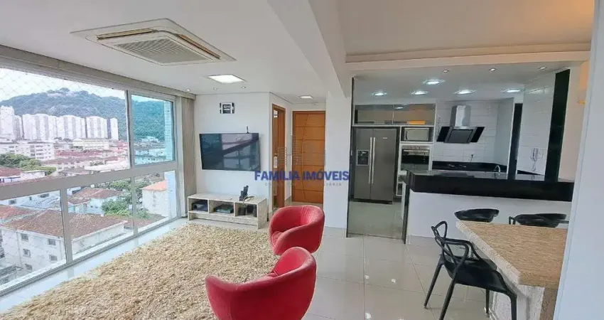Excelente apartamento à venda de 3 quartos, suíte, PORTEIRA FECHADA, andar alto, vista livre, no bairro do Marapé em Santos/SP. Totalmente mobiliado com fina decoração e provido de eletrodomésticos de excelente qualidade! Sala ampla para 2 ambientes, com piso em porcelanato, ar condicionado, televisão, sofá, poltronas, mesa em mármore travertino e lavabo. Dormitórios bem iluminados com piso laminado, móveis planejados, camas, ar condicionado e TV. Cozinha americana com móveis planejados, geladeira, cooktop, forno elétrico, microondas e iluminação embutida. Área de serviço com planejados, máquina de lavar e varal. Pias dos banheiros em mármore travertino. Despensa no corredor. Uma vaga de garagem demarcada. Prédio com magnífica estrutura, com poucos anos de uso, com ligações de água, luz e gás individuais. Área de lazer com salão de festas, churrasqueira, academia, sauna seca e úmida, ofurô e duchas. Não perca essa oportunidade!