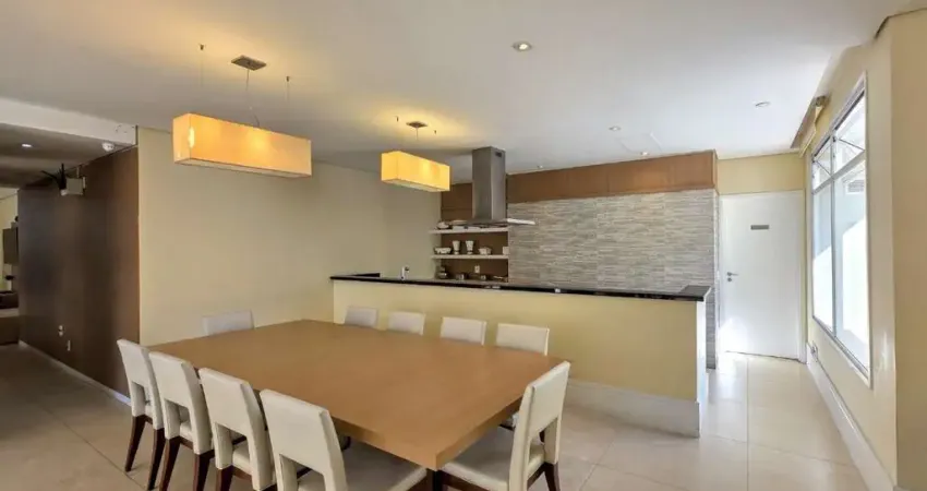 A varanda gourmet é um dos destaques deste apartamento, com uma ampla mesa de jantar para 6 lugares e fechamento em vidro, tornando o espaço perfeito para receber amigos e familiares.
