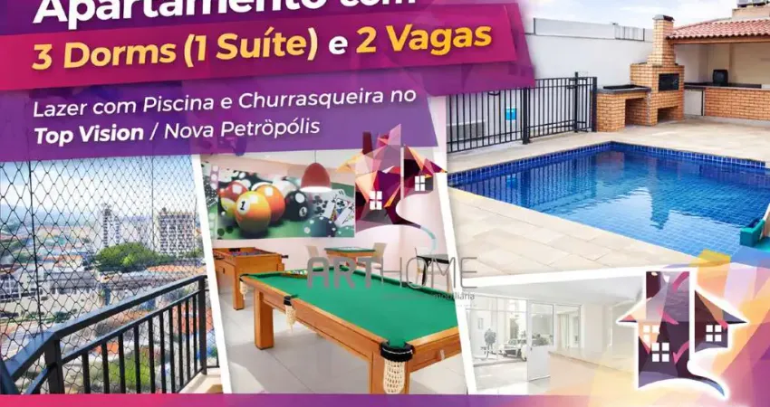 Apartamento com 3 dormitórios (1 suíte) e 2 vagas no Top Vision – Nova Petrópolis / Baeta Neves | Lazer com Piscina e Churrasqueira