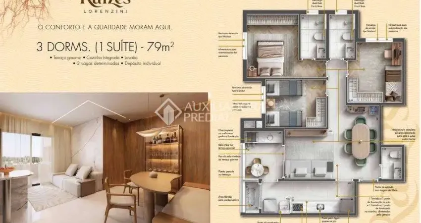 Apartamento com pé direito de 2,80 de 3 quartos, sendo uma suíte com persianas blackout de enrolar com infraestrutura para automação, banheiros com ventilação natural, Caixas acopladas com botão dual fush e ponto de ducha higiênica, nichos e ralo linear, terraço gourmet com churrasqueira a carvão com grelha e coifa, iluminação, ponto de água quente na pia, ponto de TV e ralo linear, sala com piso nivelado com o terraço gourmet, área técnica para instalação da condensadora, unidade com toda infraestrutura de ar condicionado para quartos e sala, cozinha com infraestrutura para coifa e fogão, ponto de água quente na pia de cozinha e ponto para lava-louça, filtro e dispenser de geladeira, unidade abastecida por gerador de emergência em 5 pontos garantindo aquecimento, pontos de cozinha e sala com funcionamento em falta de energia elétrica, depósito privativo de 2,5 x0,75x2,50 individual, duas vagas de garagem de 2,30 x 4,70.