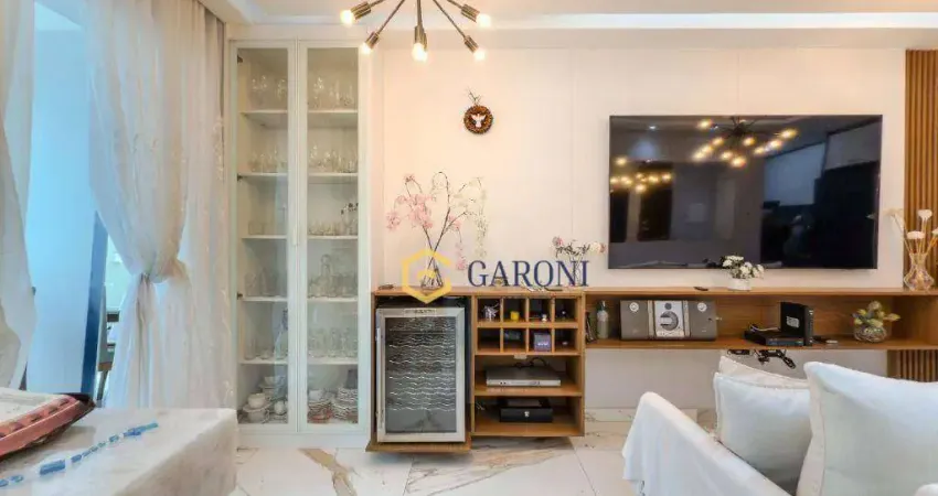 Móveis planejados em todos ambientes, piso porcelanato na sala e quarto, cozinha com porcelanato, cooktop e forno, dois banheiros com ducha, espelho, pia de granito branco.