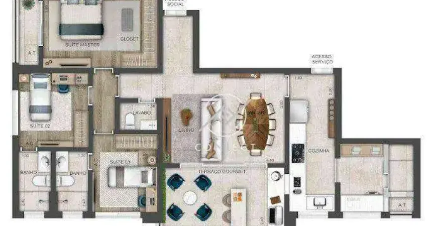 3 suítes com living, cozinha e terraço integrados