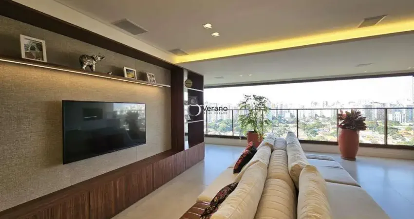 Apartamento mobiliado à venda no Campo Belo, com 146 m², três suítes, escritório, duas vagas de garagem e depósito. Localizado em condomínio recém-entregue com lazer completo e assessoria esportiva. O imóvel foi projetado com integração entre os ambientes. A sala ampla possui porcelanato 1,20 x 1,20 e varanda gourmet integrada, garantindo área social iluminada e funcional. O projeto inclui parede verde com irrigação automatizada, sofá motorizado e sistema de som instalado. A cozinha é aberta para a sala, com proposta moderna e prática. O lavabo conta com pia em granito flameado. O escritório possui portas antirruído, piso e teto com isolamento acústico. A área íntima tem três suítes com vista da cidade e piso em madeira Cumaru; o banheiro da suíte máster é finalizado em mármore Marrom Imperador. O imóvel conta com marcenaria sob medida, bancadas em mármore Paraná e lavanderia espaçosa. O condomínio oferece estrutura completa e o apartamento inclui duas vagas e depósito privativo. 16/12/2025