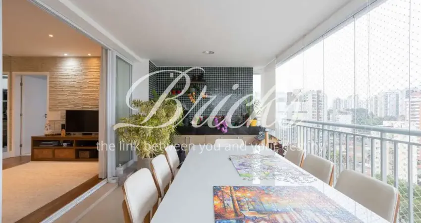 A área íntima dispõe de três dormitórios, sendo uma suíte, todos com marcenaria planejada. O apartamento conta ainda com banheiro social, lavabo, duas vagas de garagem e depósito privativo.