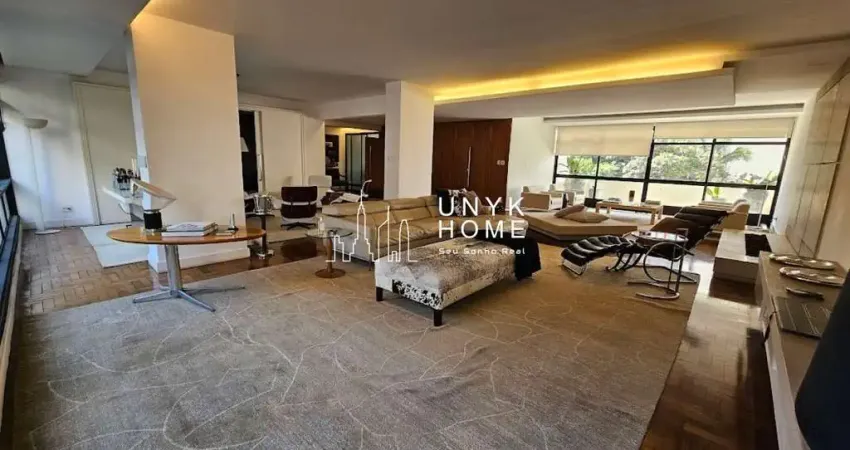 Apartamento para locação com 455 m² de área útil, distribuídos em ambientes amplos, elegantes e muito bem planejados. A área social impressiona logo na entrada, com cinco salas integradas entre estar, jantar e ambientes de convivência, todas com excelente iluminação natural, piso de madeira, teto rebaixado e lustres que valorizam o espaço. O imóvel conta ainda com lavabo, escritório e ar condicionado, proporcionando conforto e funcionalidade para o dia a dia e para receber convidados.