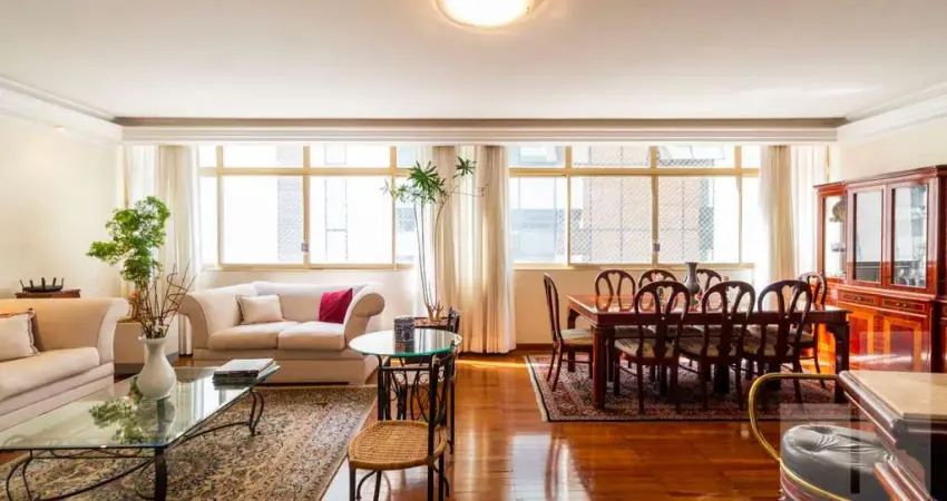 Apartamento em andar alto, muito privilegiado com luz natural, sala para dois ambientes super espaçosa, janelas em toda extensão com cortinas. Ao entrar para a área dos quartos há um hall com muitos armários, em frente a um banheiro que atende a 2 dormitórios. Esse amplos dormitórios possuem grandes armários embutidos e bancadas. Cozinha e copa bem equipadas, com grandes janelas, conectando-se com área de serviço espaçosa, com banheiro e quarto de serviço. Dependências espaçosas e claras. Pé direito alto. São duas vagas de garagem, demarcadas e cobertas. Fácil acesso á transporte público. Excelente localização, próximo ao Shopping Higienópolis, acesso fácil a faculdades, mercados, farmácias, bancos, padarias, restaurantes e estações de metrô. Bem localizado.