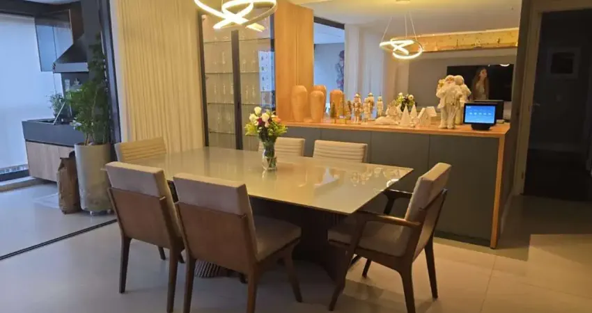 O apartamento conta com 3 suítes bem distribuídas, garantindo privacidade e conforto para toda a família. Possui também um lavabo, uma cozinha integrada que proporciona um ambiente mais social e acolhedor, além de uma área de serviço funcional. Todos os ambientes são climatizados com ar-condicionado central, oferecendo conforto em todas as estações.