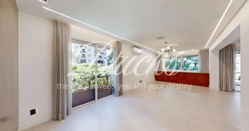 Apartamento de 236m² amplo e iluminado, totalmente reformado em 2021, com 3 suítes, sendo a master com dois closets, dois banheiros e home-office. Sala de estar integrada à sala de jantar, e seu terraço para um amplo jardim gramado. Possui 4 vagas de garagem próprias e um depósito.