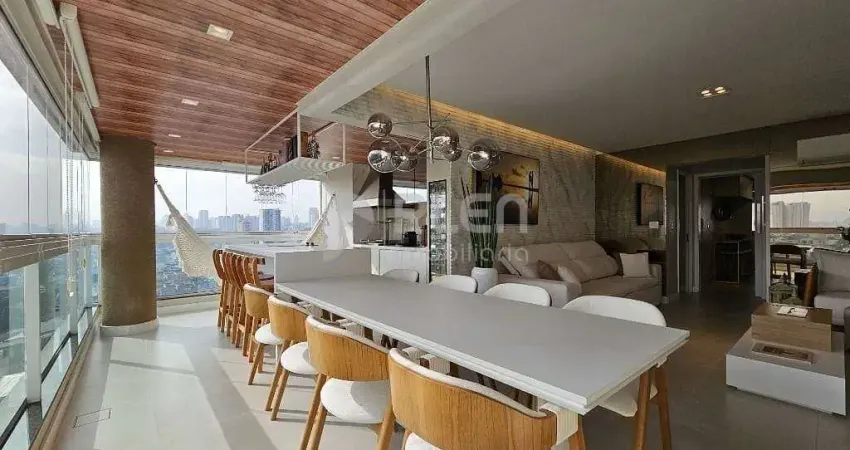 3 dormitórios com armários sendo 1 suíte master com closet (2 dormitórios suíte americana), varanda gourmet integrada com fechamento em vidro com excelente vista livre, sala ampla para 2 ambientes, lavabo, cozinha equipado com forno, cooktop, exaustor e armários, área de serviço com armários e banheiro, 3 vagas de garagem fixas.