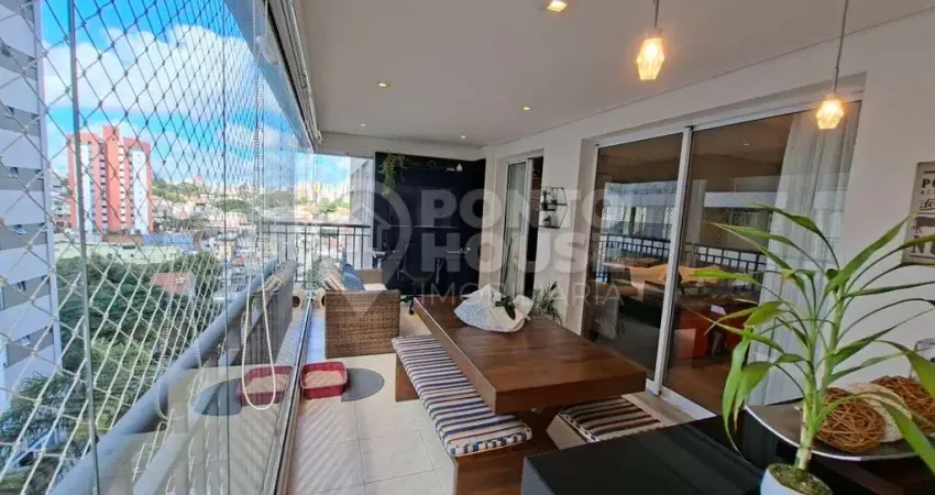 Ampla sala para 2 ambientes com varanda gourmet com fechamento em vidro e churrasqueira a carvão.