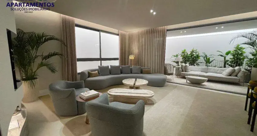 Sala integrada à varanda com churrasqueira, acabamento sofisticado e infraestrutura completa (ar-condicionado, aquecimento a gás, persianas motorizadas)