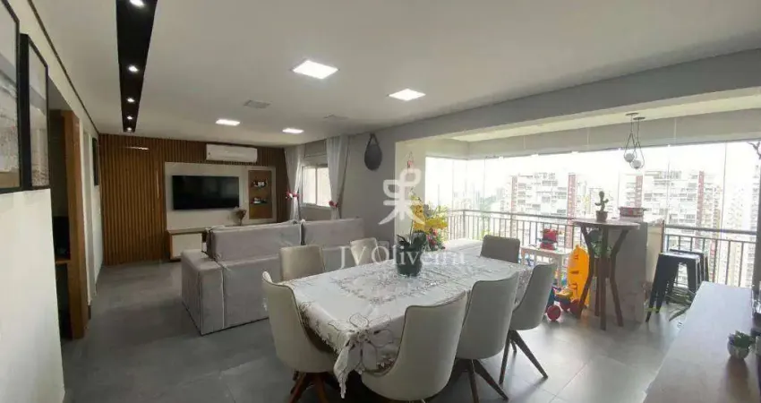 Ampla e moderna sala de estar e jantar integrada com varanda envidraçada e vista da cidade. Destaque para o painel de madeira com TV, mesa de jantar com 6 lugares e a varanda com balcão e iluminação natural abundante. Sofá grande, piso em cerâmica cinza e iluminação embutida completam o ambiente confortável e familia. Cozinha moderna e funcional com bancada em pedra clara, armários planejados em tom de madeira, cooktop, coifa em inox e pia com cuba dupla. Integração com a área de serviço e iluminação embutida. Suite casal com cama king size, cabeceira estofada, armário planejado com espelho, penteadeira iluminada e televisão fixada na parede. Cortinas claras proporcionam luminosidade suave. Banheiro suite casal elegante com revestimento em porcelanato marmorizado, box de vidro, ducha moderna, nicho embutido para produtos de higiene e metais cromados.