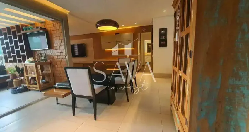 Apartamento planejado, pronto para uso imediato. O imóvel possui sala de estar integrada à sala de jantar, adega e espaço destinado à convivência. A área gourmet conta com churrasqueira e parede em tijolinhos aparentes. O projeto luminotécnico está presente em diferentes ambientes, valorizando a iluminação e o uso funcional dos espaços.