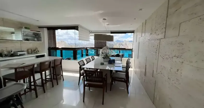 Apartamento com acabamento luxo com área total aproximada de 156m². Sala para 2 ambientes em fino acabamento com armários e rebaixamento, ar condicionado e som ambiente, Lavabo, rouparia, 4 quartos com armários sendo 2 suíte e 2 semi-suítes, banho social. Cozinha americana com armários e bancadas em granito, área de serviço com armários, DCE.
