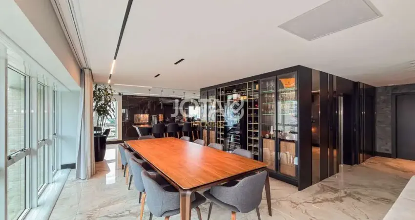 São quatro suítes, a master com closet e hidromassagem, banheiros com piso aquecido, adega climatizada, escritório, sala ampla para 4 ambientes e totalmente integradas. Cozinha e área gourmet com churrasqueira a carvão e eletros da Elettromec.