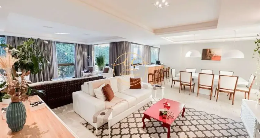 Ampla sala em 3 ambientes, lavabo, varanda gourmet com cortina de vidro, cozinha planejada, área de serviço, dependência completa revertida para quarto, 2 suítes com móveis planejados, 1 com varanda, 2 quartos, banheiro social.