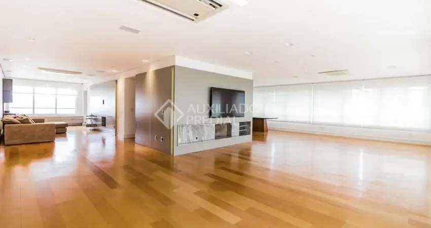 Perfeito apartamento semi-mobiliado alto padrão. Um por andar. São 4 suítes transformados em 3, sendo uma master com um amplo closet. Belíssimo living em L, sala de estar e jantar interligada com churrasqueira, lavabo, ampla cozinha, dependência de empregada completa, área de serviço separada e persianas elétricas. Andar alto e imensa área social envidraçada com linda vista. São 4 vagas de garagem cobertas e escrituradas com depósito. Edifício com portaria 24hs, piscina externa aquecida, sauna, spa, sala fitness, playground, caldeira e aspiração de pó centralizada. Edifício com pé direito duplo, hall de entrada com piso em granito, paisagismo, port cochere.