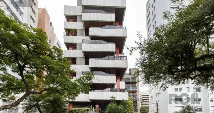 Belíssimo apartamento em Petrópolis, com enorme sacada com piscina, 253,55 m² de área privativa, com 4 quartos, sendo 2 suítes, escritório, 3 vagas individuais e 3 depósitos. Espaço gourmet com churrasqueira em ambiente independente do living, que também dá acesso à varanda com piscina exclusiva do apartamento. Ampla lavanderia e dependência completa de empregada. O imóvel conta ainda com ar condicionado central. Edifício imponente, com elevador, salão de festas e lindo paisagismo. Excelente localização, próximo à Avenida Carlos Gomes, em zona alta e nobre de Porto Alegre. A apenas 2,2 km da Unisinos (Nilo Peçanha) e 3 km do Colégio Anchieta. Edifício exclusivo, com poucas unidades.