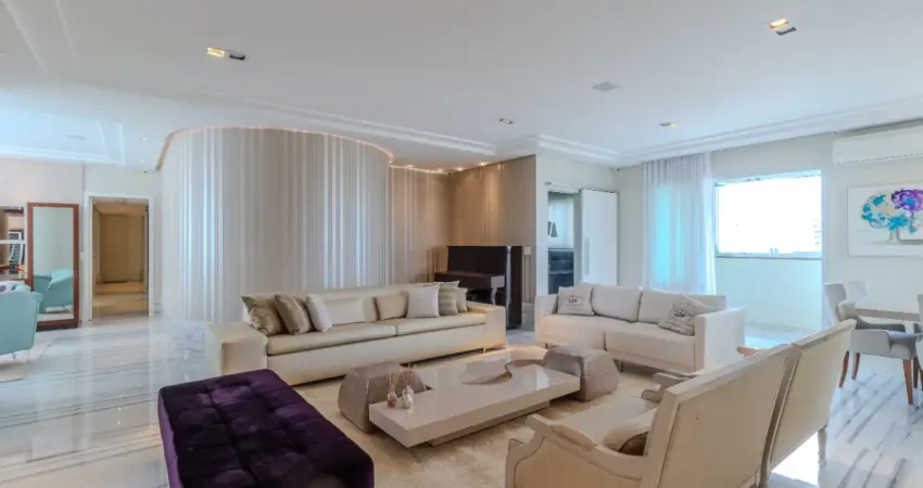 O amplo living integra sala de estar e jantar à sofisticada área gourmet com churrasqueira e espaço de TV, criando o cenário perfeito para receber com elegância. Lustres de cristal enriquecem os ambientes, enquanto a segunda sala de estar com adega convida a momentos reservados e memoráveis. Um amplo escritório complementa a planta, oferecendo privacidade e imponência para seu home office.