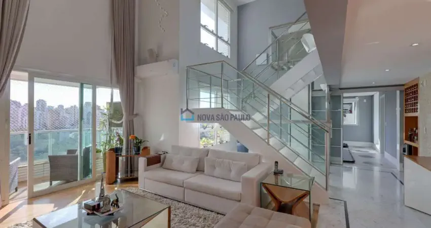 Assinada pelo renomado arquiteto João Armentano, esta cobertura duplex impressiona pelo design e pela vista deslumbrante para o Parque da Aclimação. O living conta com pé-direito duplo, lareira charmosa e integração à varanda, além de home theater equipado e sala de jantar.