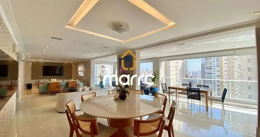 Maravilhoso apartamento com 274m² à venda no Campo Belo. Amplo living com 3 ambientes, varanda gourmet com churrasqueira à carvao integrada à cozinha e sala, cozinha com despensa e repleta de armários, 3 suítes sendo a suíte master com banheiro Sr. e Sra e repleta de armários, e um dormitório a mais sendo usado como brinquedoteca e que você pode usar também como escritório. Ar condicionado em todos os ambientes, forro e iluminação em perfeito estado. O condomínio oferece uma excelente infraestrutura de lazer e está numa localização privilegiada. Rua tranquila e arborizada, próximo de tudo.