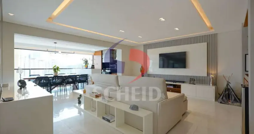 Varanda gourmet integrada, móveis feitos por designer renomado, ar-condicionado e uma cozinha moderna e equipada, repleta de armários.