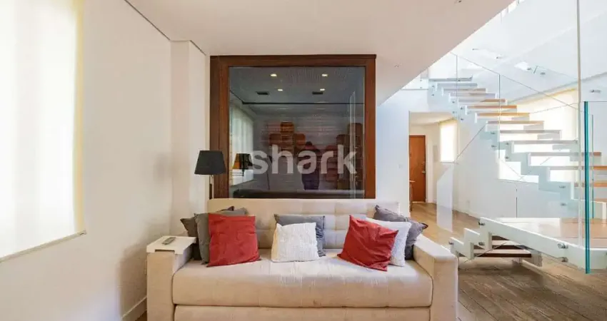 -Cobertura no coração do Jardim Paulista com living amplo, sala de jantar com espaço para mesa de 10 lugares, sala de TV com home theater e sofá, lareira e piso em pedra.