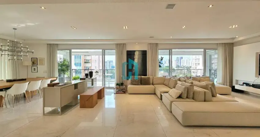 A área social tem piso em mármore, integração entre os ambientes e sistema de som e automação de iluminação Lutron. A varanda em L percorre toda a extensão da sala, conectando o living, a sala de jantar e o espaço gourmet, que também se abre para a sala de almoço.