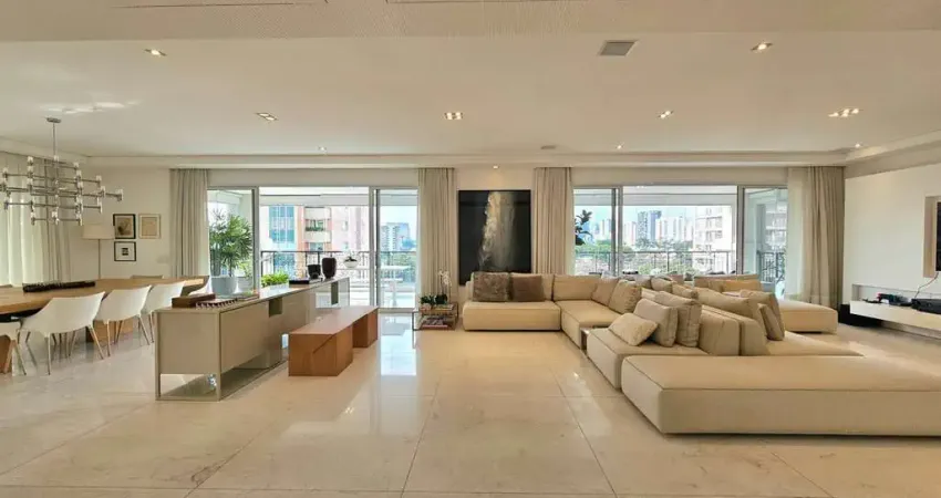 Logo na chegada, o hall social já antecipa o clima do apartamento: elegante, bem resolvido e marcado por proporções generosas em seus 400 m² e pé-direito alto em todos os ambientes.