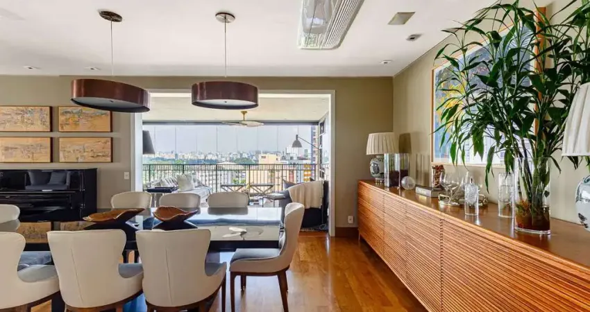 Terraço gourmet espaçoso, equipado com cortinas automatizadas e uma vista para o Parque Ibirapuera.
